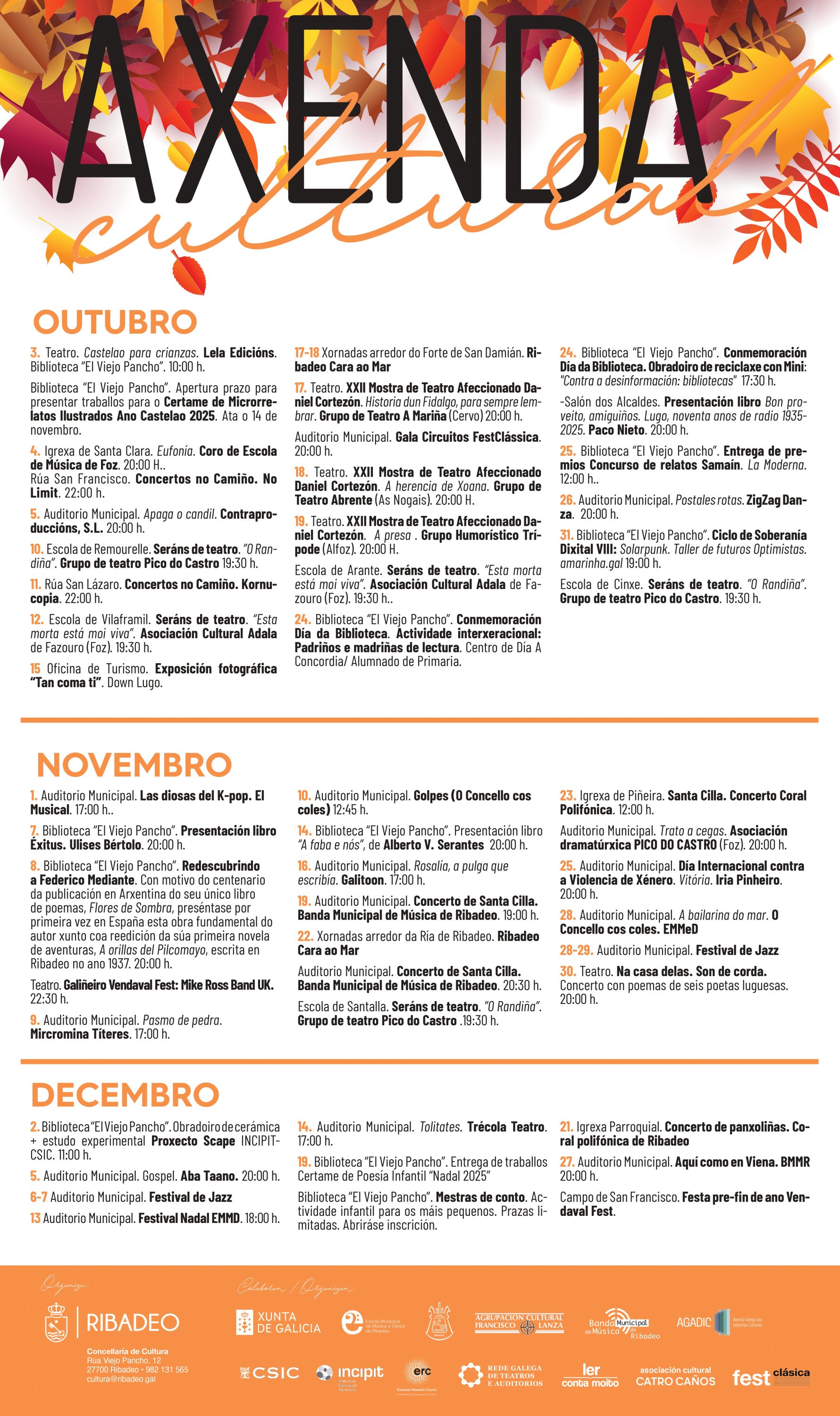 A concelleira de Cultura explicou que “preparamos unha axenda diversa para este último trimestre do ano, pensada para chegar a toda a veciñanza, desde o público infantil ata o adulto, e que combina teatro, música, literatura, exposicións e obradoiros. Queremos que Ribadeo siga sendo un referente cultural na comarca e que cada trimestre a cidadanía poida gozar de novas propostas de calidade”.