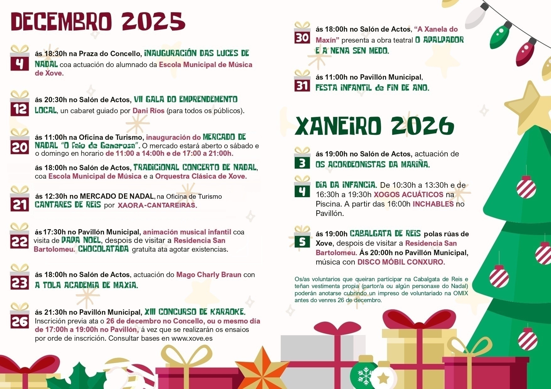 Non faltarán tampouco os eventos máis esperados de cada ano, como a visita especial de Papá Noel o día 22 e, o 5 de xaneiro, a tradicional Cabalgata de Reis polas rúas de Xove, que porá o broche final ás festas de Nadal.
