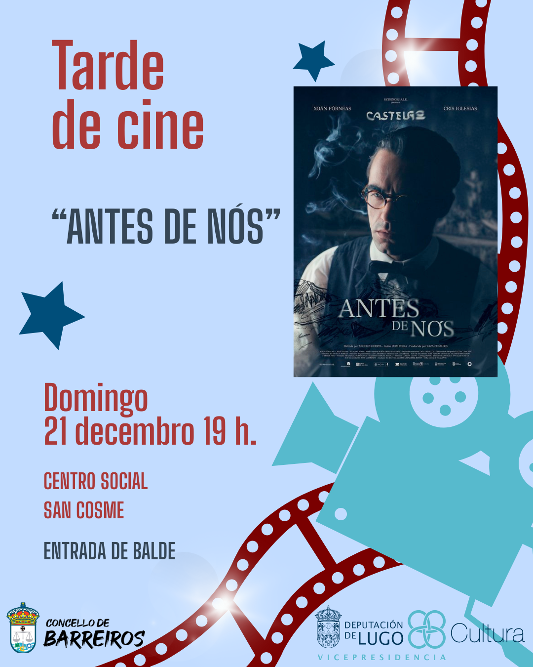 Xa o domingo 21 de decembro, ás 19:00 horas, o centro sociocultural de San Cosme acollerá unha tarde de cine coa proxección da película “Antes de nós”. O filme debuxa dous momentos decisivos na vida de Castelao e da súa compañeira Virxinia antes de converterse nunha das figuras centrais da cultura galega.
