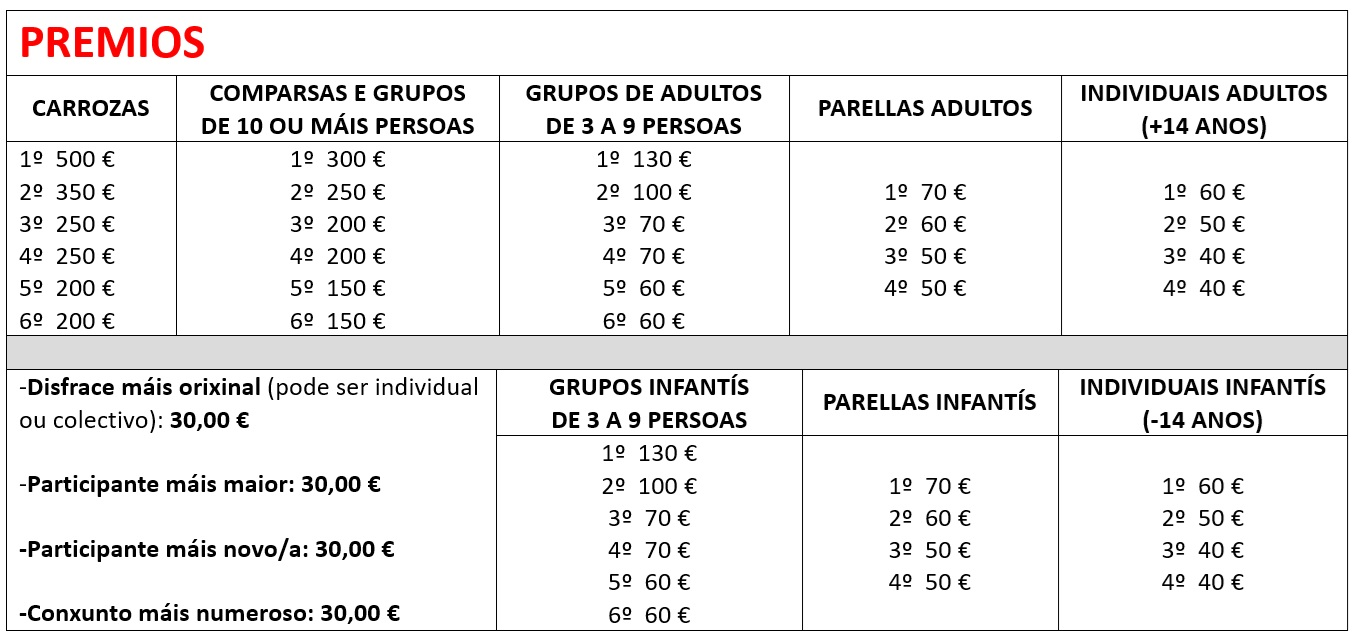 Segundo as Bases do Concurso do Gran Desfile de Entroido de Xove 2026, repartiranse 5.385 euros en premios nas diferentes categorías establecidas.
